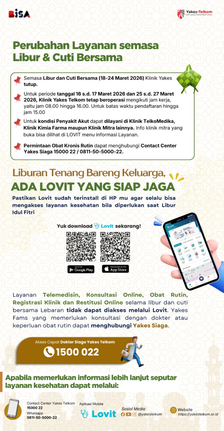 Selama periode Libur & Cuti Bersama Idul Fitri, terdapat penyesuaian layanan di Klinik Yakes Telkom dan aplikasi LOVIT agar pelayanan tetap terkelola dengan baik.